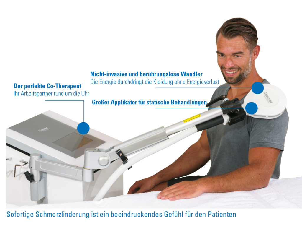 Für statische Behandlungen wird der große Applikator verwendet, der am Applikatorarm montiert ist. Die Schmerz- und Triggerpunkte für die statische Behandlung werden zunächst getastet. Dann wird die Behandlung mit der Ausgangsleistung verabreicht. Jeder Schmerz- oder Triggerpunkt wird behandelt. Es ist zu beachten, dass Triggerpunkte häufig außerhalb des Schmerzbereichs liegen.